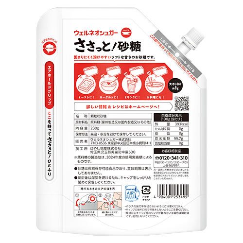 空気が入った持ち手付きだから、片手でもしっかり握れて振り出しやすいです。中身が減ってきても自立するパッケージで、詰め替えも不要。フロストシュガーよりもさらに小粒な顆粒状のお砂糖なので、冷たい飲み物やヨーグルトにさっと溶けます。また、お肉やお魚の下ごしらえの際にもなじみやすく、日々の料理にも手軽に使うことができます。グラニュ糖を原料とした高純度なお砂糖だから、素材の風味を損なわないソフトな甘さです。